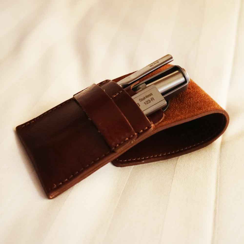 LEDライト付きトゥイザーズ ヤスル 爪切りが一つの革の スラッシュケースに収まった 旅行に最適の携帯品。良いものはいつでも身近に身に着けていたい