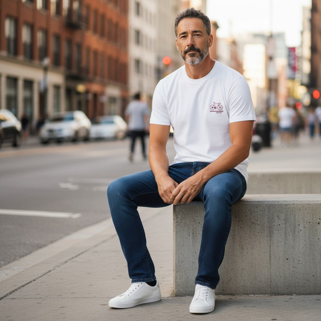 自転車のシルエットを胸にワンポン シルクプリントで落とし込んだ Tシャツ。自転車に乗った時の風をもう一度取り戻しませんか〰。ゆらゆらしながら 足が地面から離れ自転車にのれた時のあのなんとも言えない喜び… 自転車は最も人間らしい移動の道具ではないでしょうか!