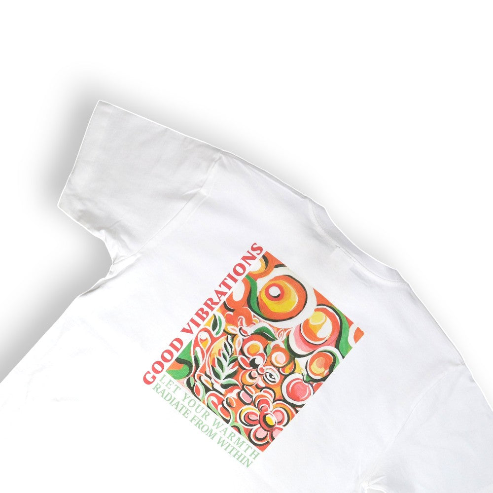 グッドバイブレーションは地球上のエネルギーから湧き上がるエネルギーを花、葉、果実などがどんどん絵に湧き上がってくるような名作。真にグッドバイブレーション 地球のポジティブな響きが揺れ動くTシャツ。お洒落して出かけるのが楽しみになるMINASAのアートTシャツ。