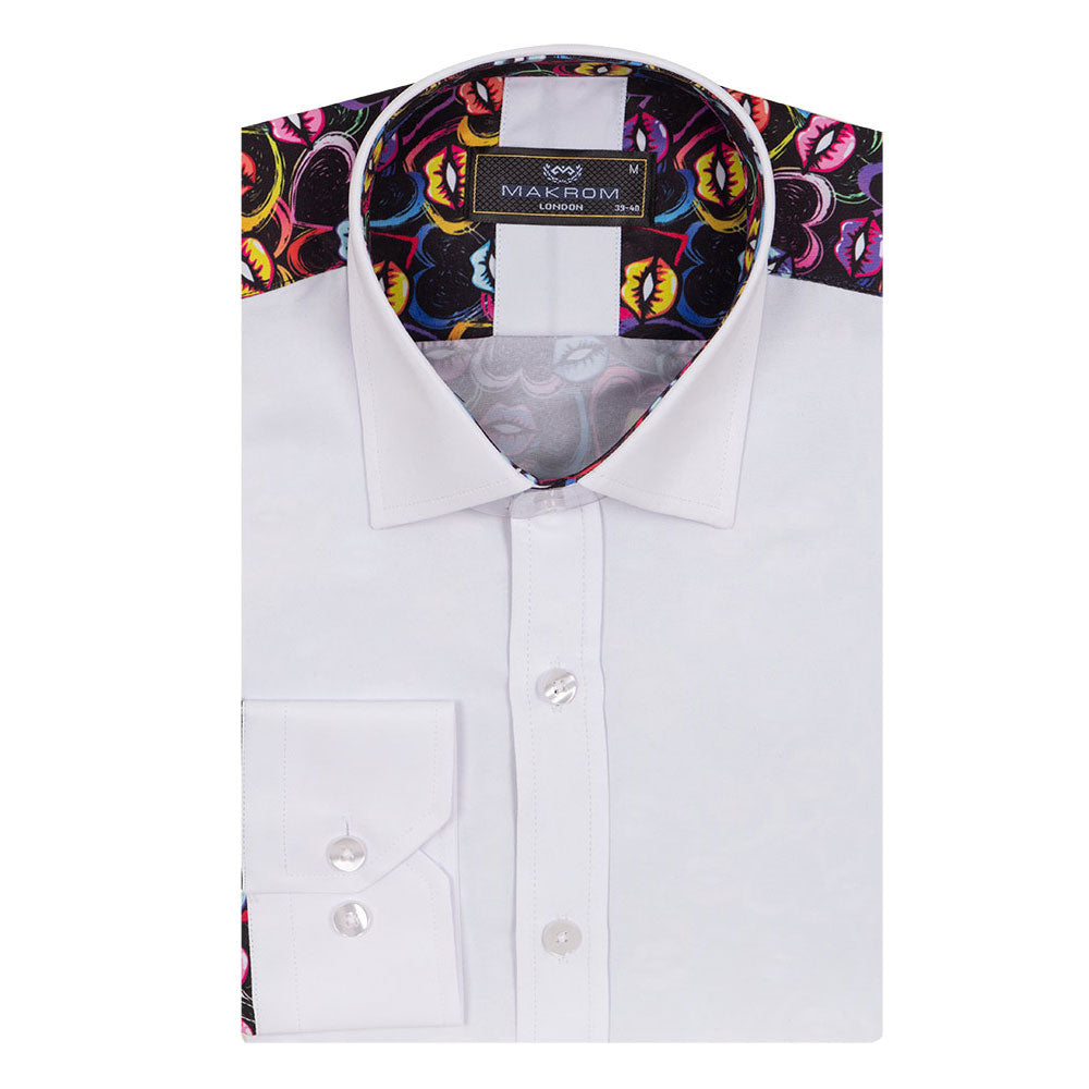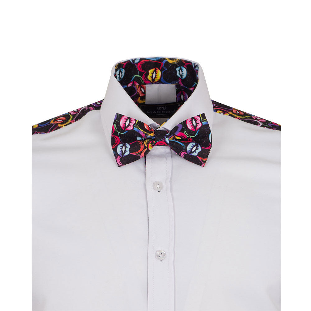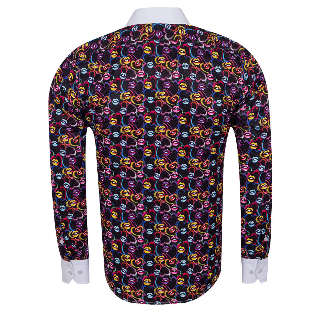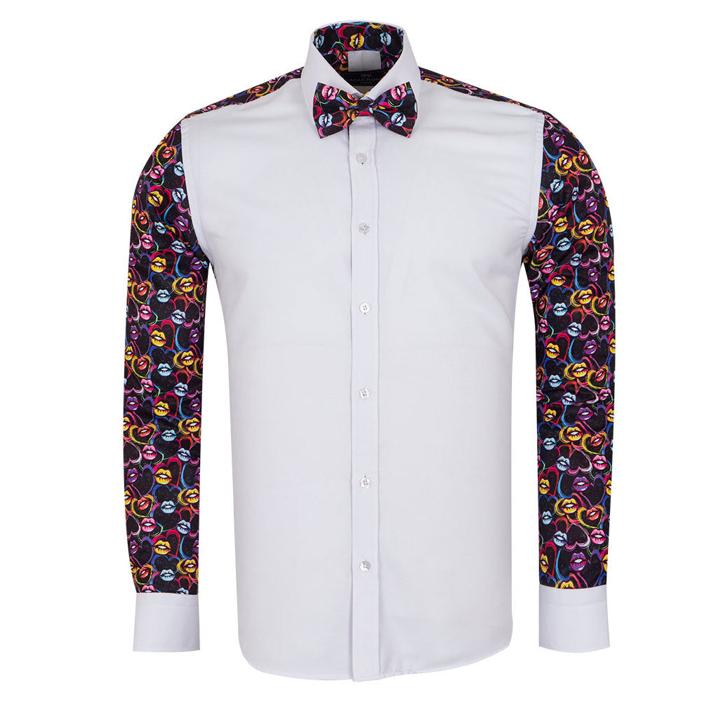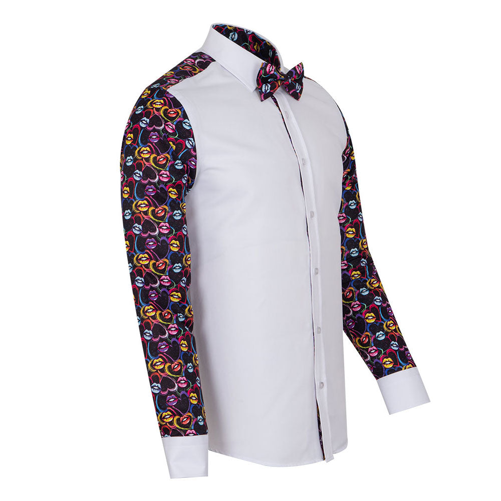 袖の周りと背面に熱いキッスマークのプリントが施された遊び心いっぱいのドレスシャツ パーティーや2次会に是非とも着飾って出かけて頂きたい個性的なドレスシャツです。ちょっと遊び心あるシャツは場が和み心地よい時間がながれます。マクロムのドレスシャツを是非とも一度ご試着ください。