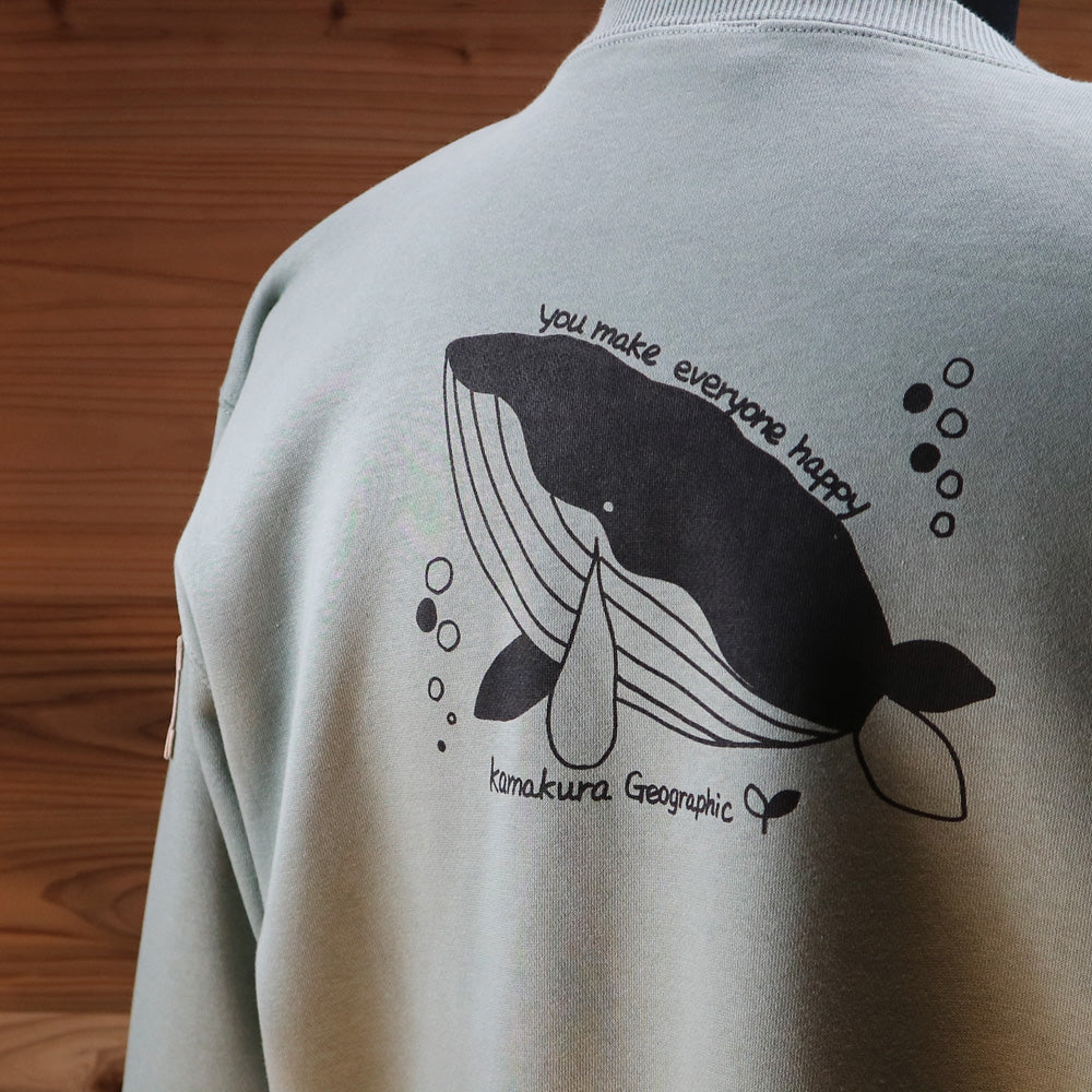 Happy Whale のスエットシャツア裏の仕上げぱ起毛仕上げの物を使用してプリントしています。色と着心地にこだわった癒しデザインスウェット