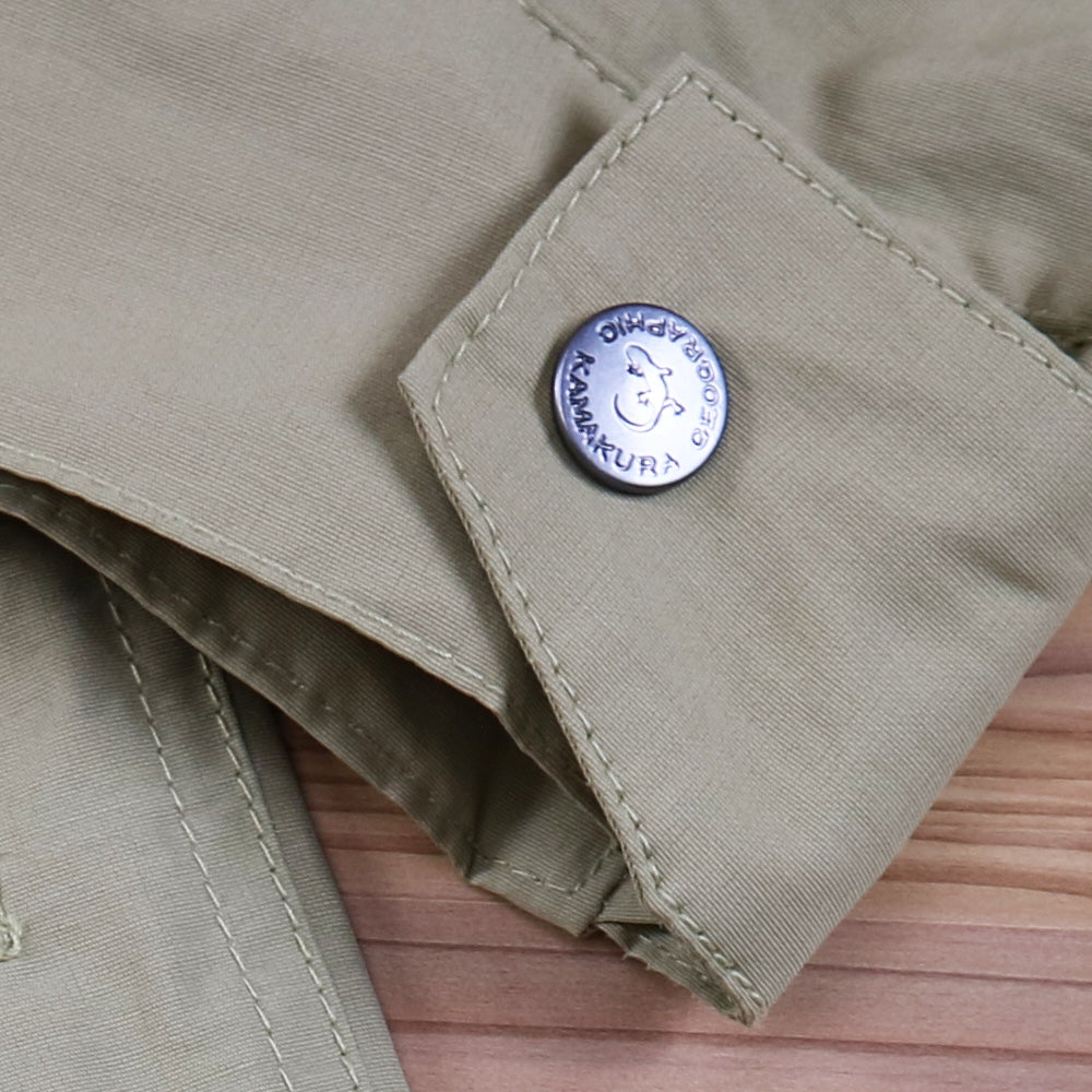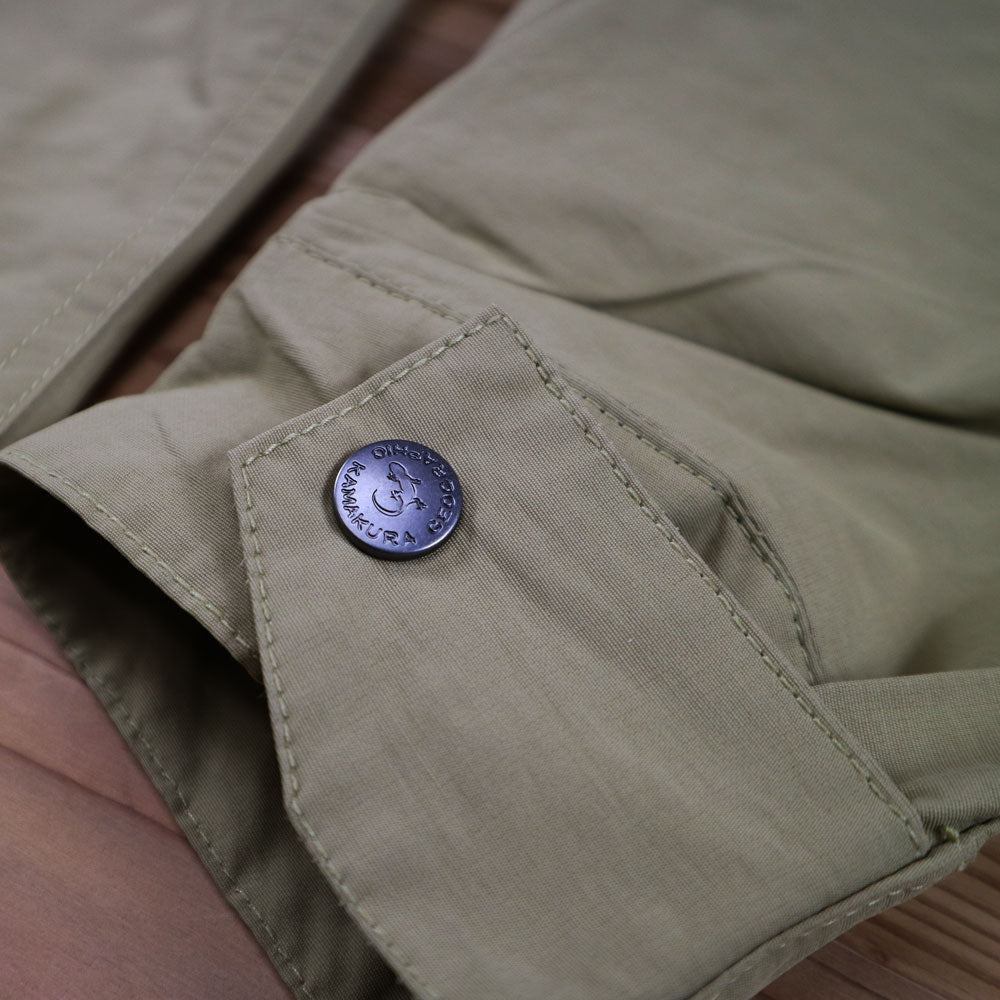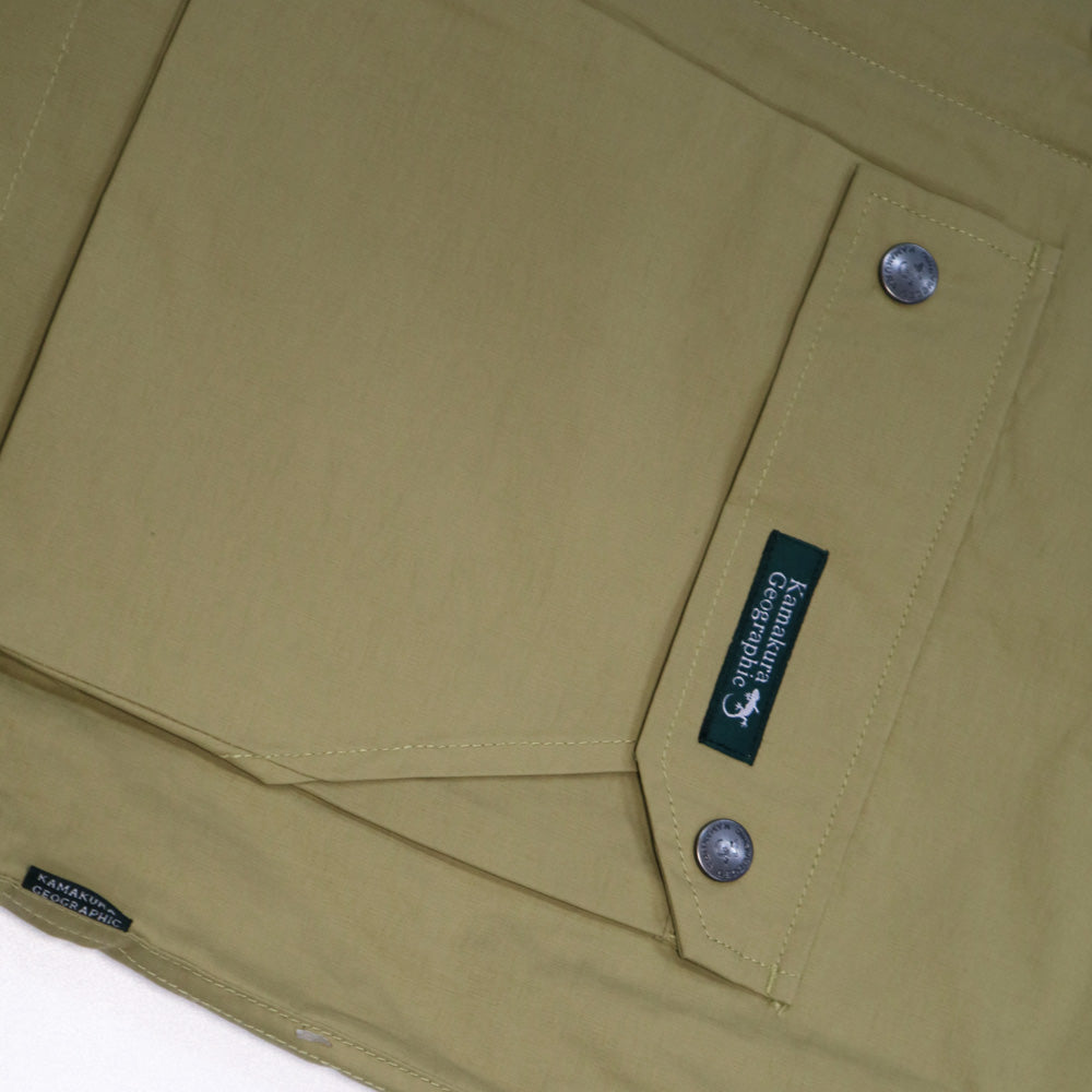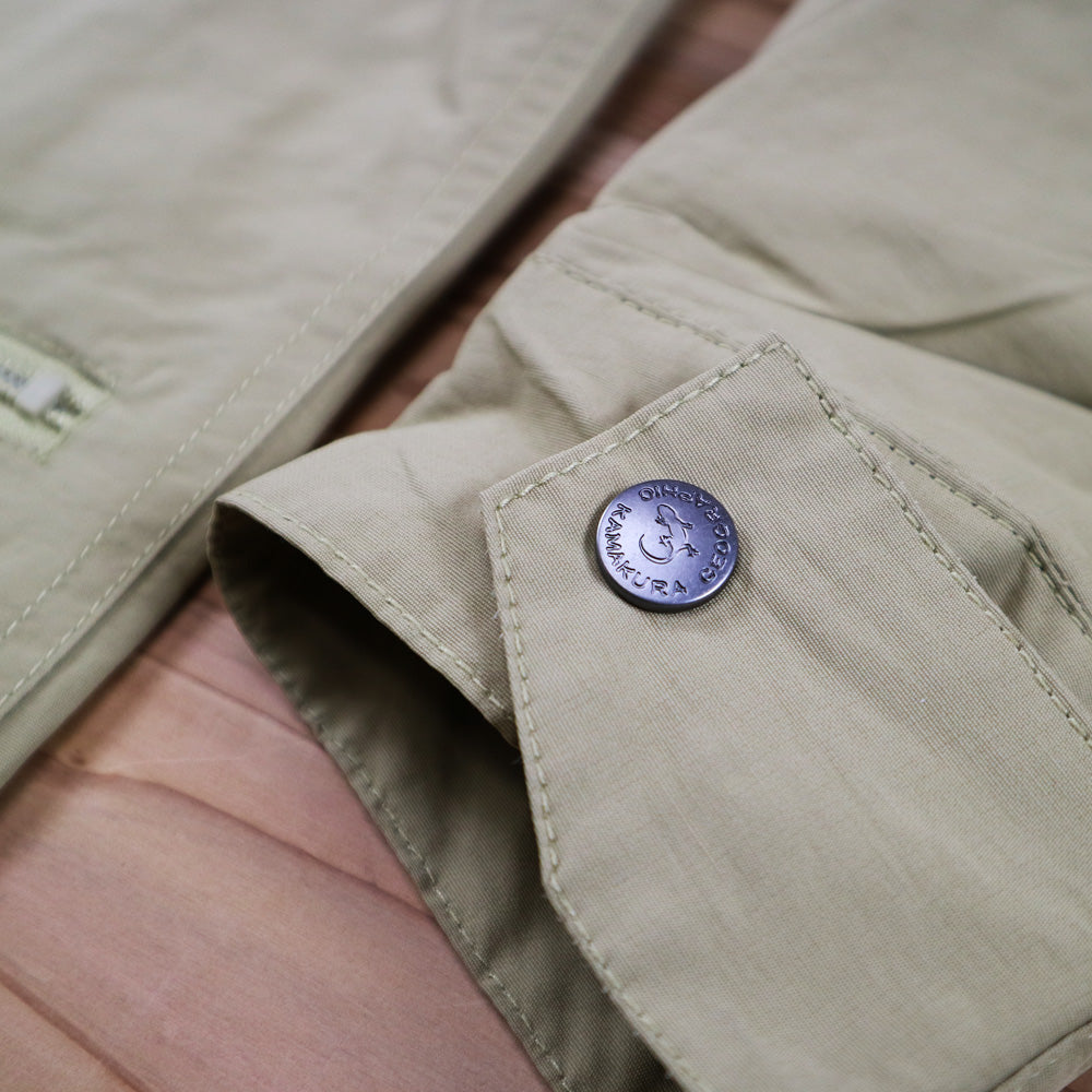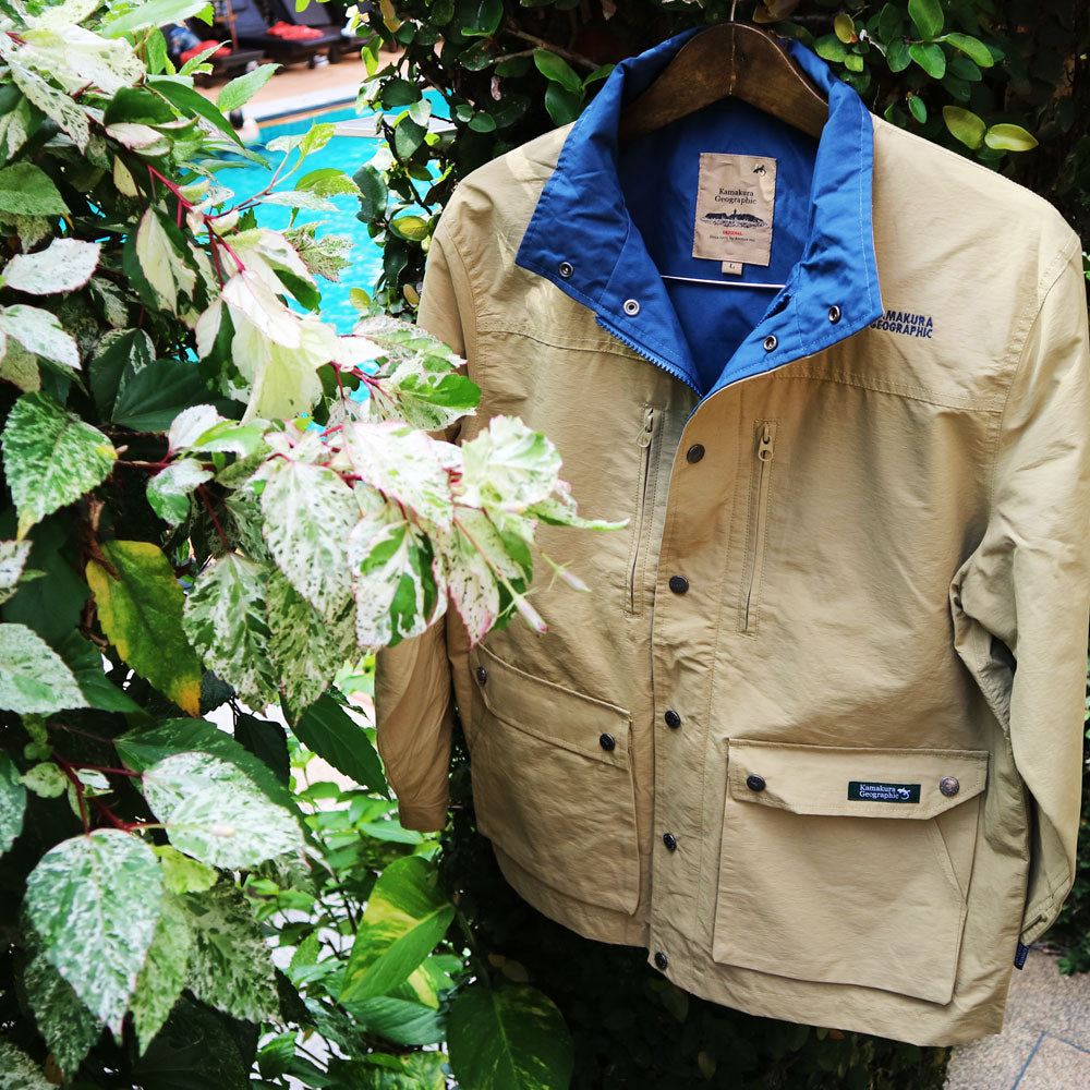 鎌ジャン 大人の雰囲気を醸し出すアウトドアジャケット。 日常生活を重ねる時に重要なディテールを凝縮した鎌ジャンボディー。横糸コットン60%に40%の縦糸ナイロンを使用。コットンのテイストとナイロンの強度を持ち合わせたブレンド素材。雨に濡れるとコットン素材が膨張して密度が増し 撥水性が向上する 自然が持つ特色を入れた鎌倉ジオグラフィックオリジナルジャケット。