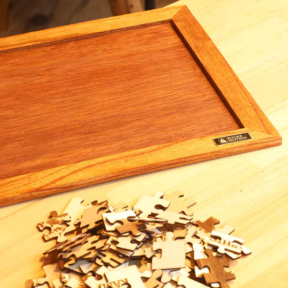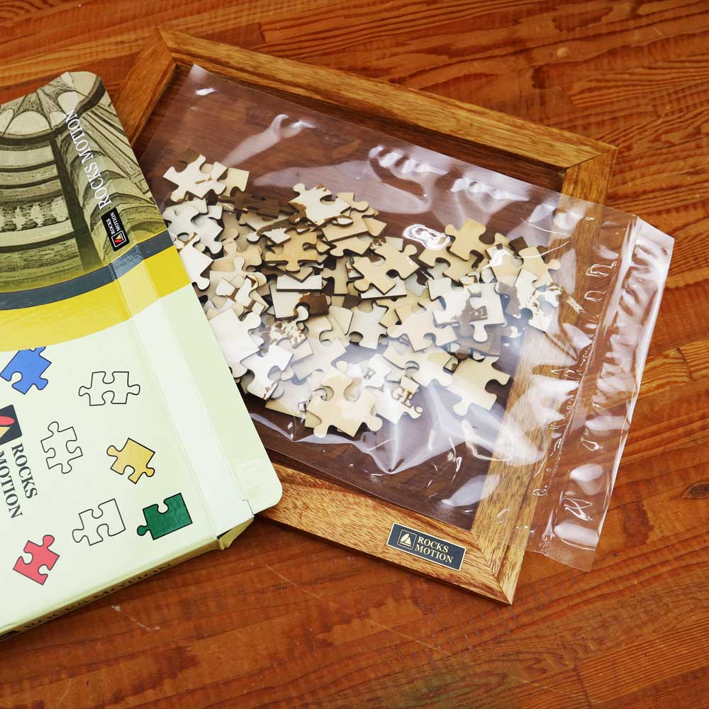 ロックスモーションには木製の木のフレームが付属させれいます。フレームの上で組み立てられるので途中でもすんなりと部屋の片隅に収めておくことができます。勿論 組みあがってから何度か崩して 再度作り上げる事もできます。完成品を楽しみたい場合はパズルの裏に紙テープなどをはってフレームに収めて部屋のインテリアとして飾っておくこともできます。