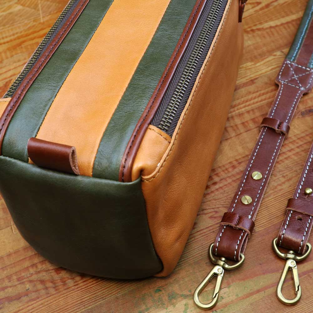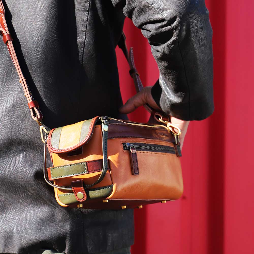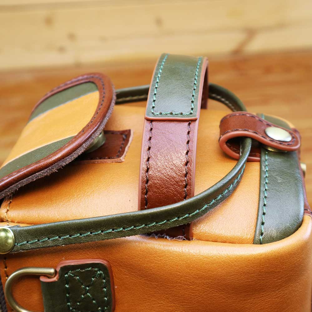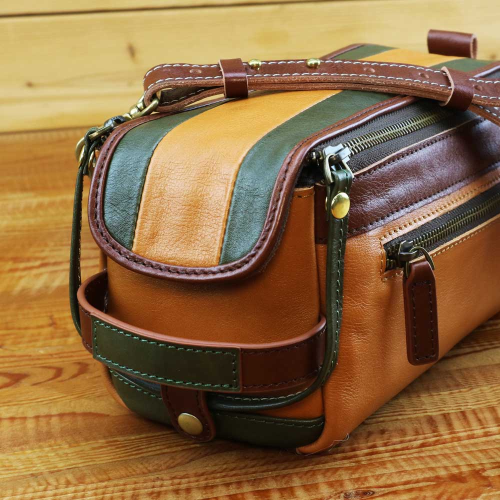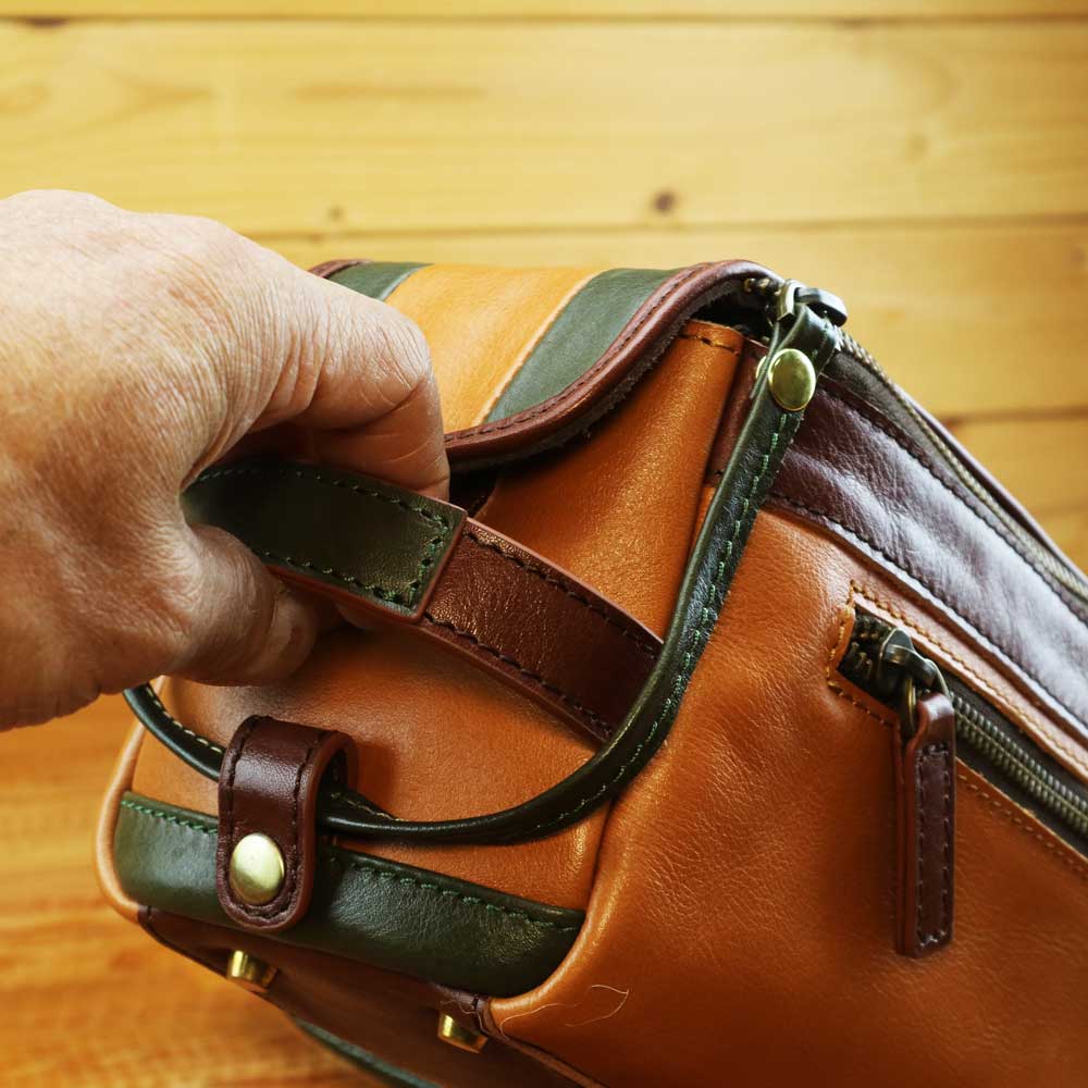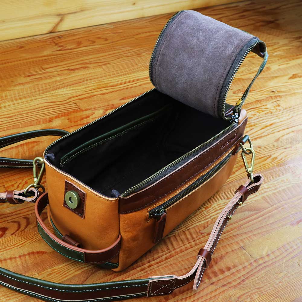 安定したボックスタイプの本体は実に使いやすい 今までにないタイプのバッグをグローブレザーできめ細かに縫製した。