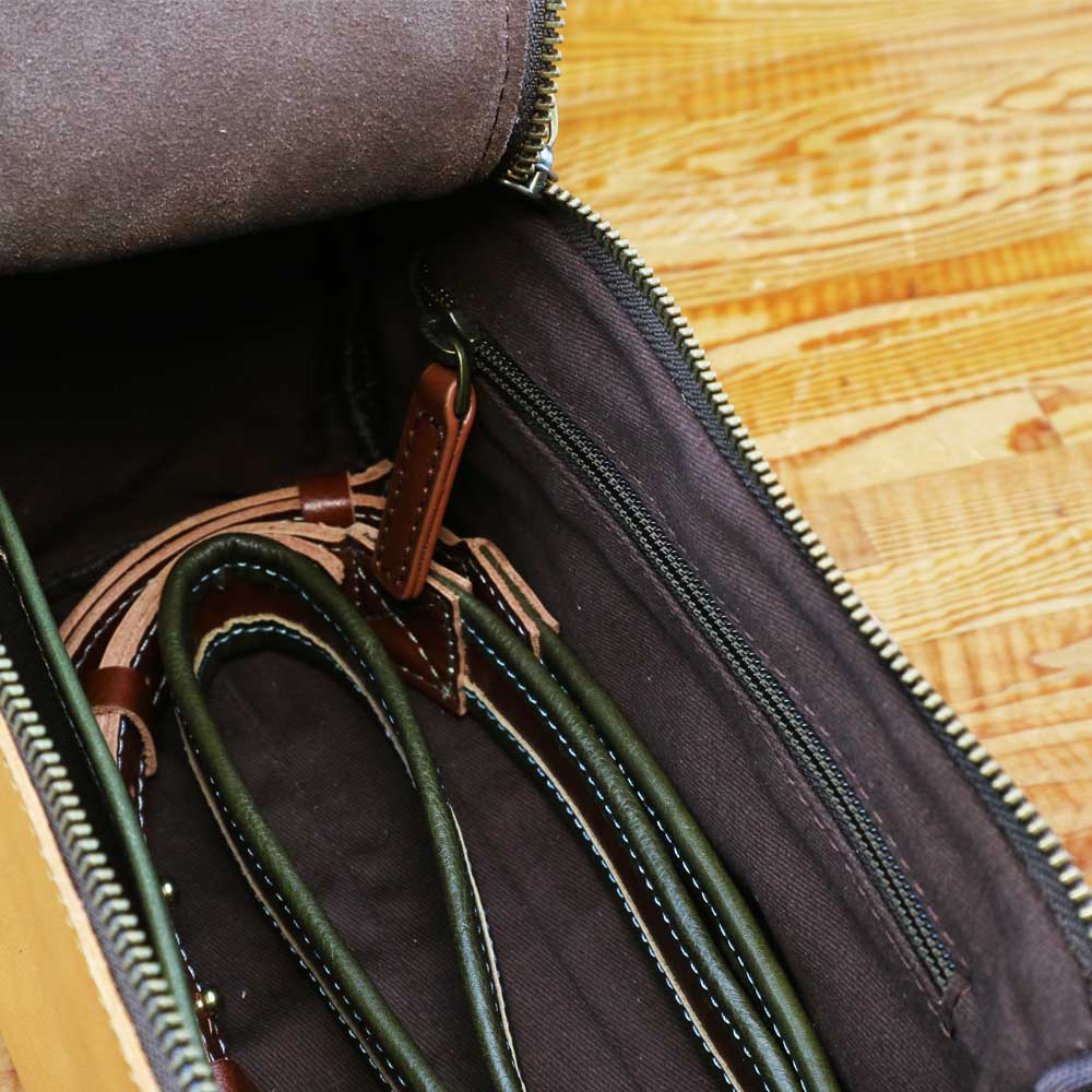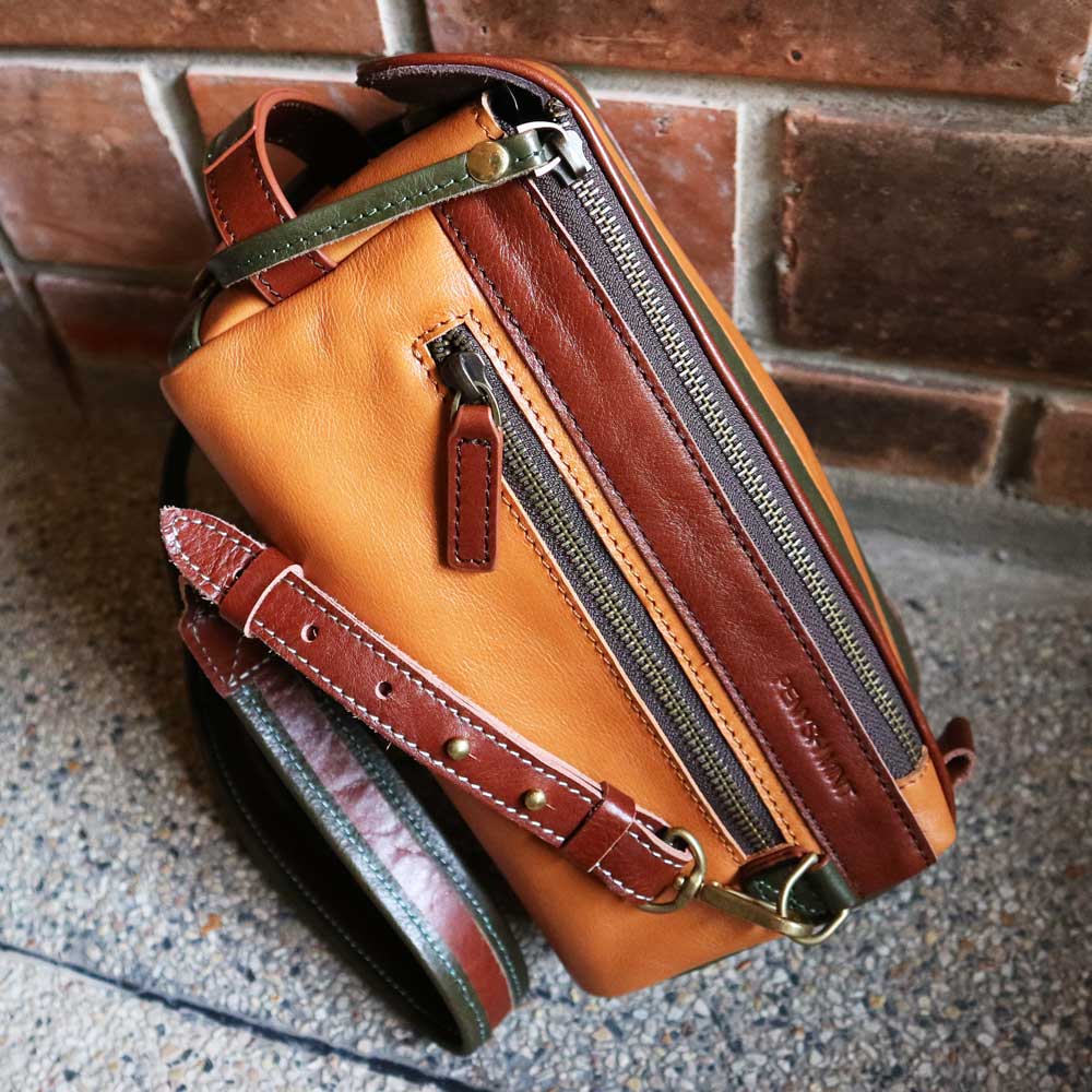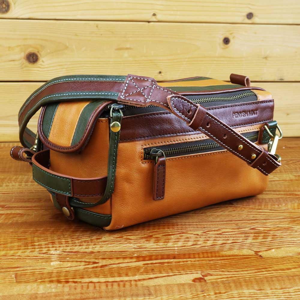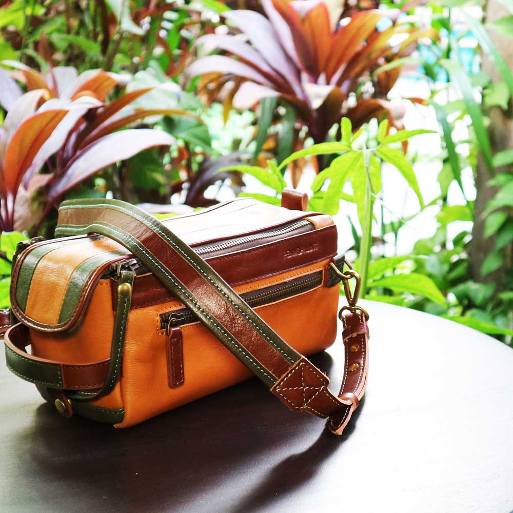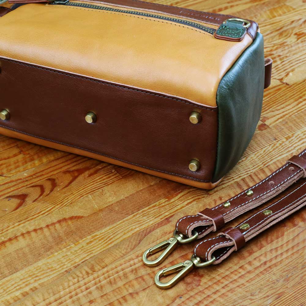 安定したボックスタイプの本体は実に使いやすい 今までにないタイプのバッグをグローブレザーできめ細かに縫製した。