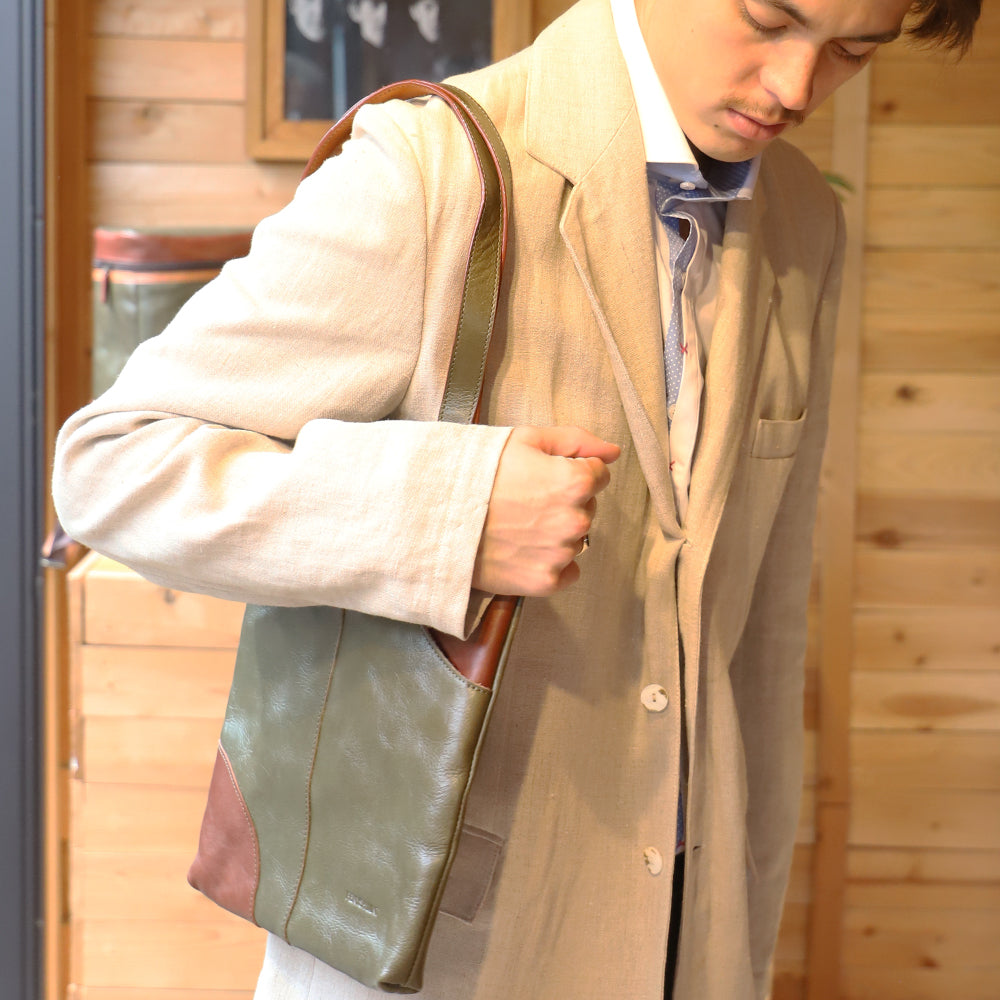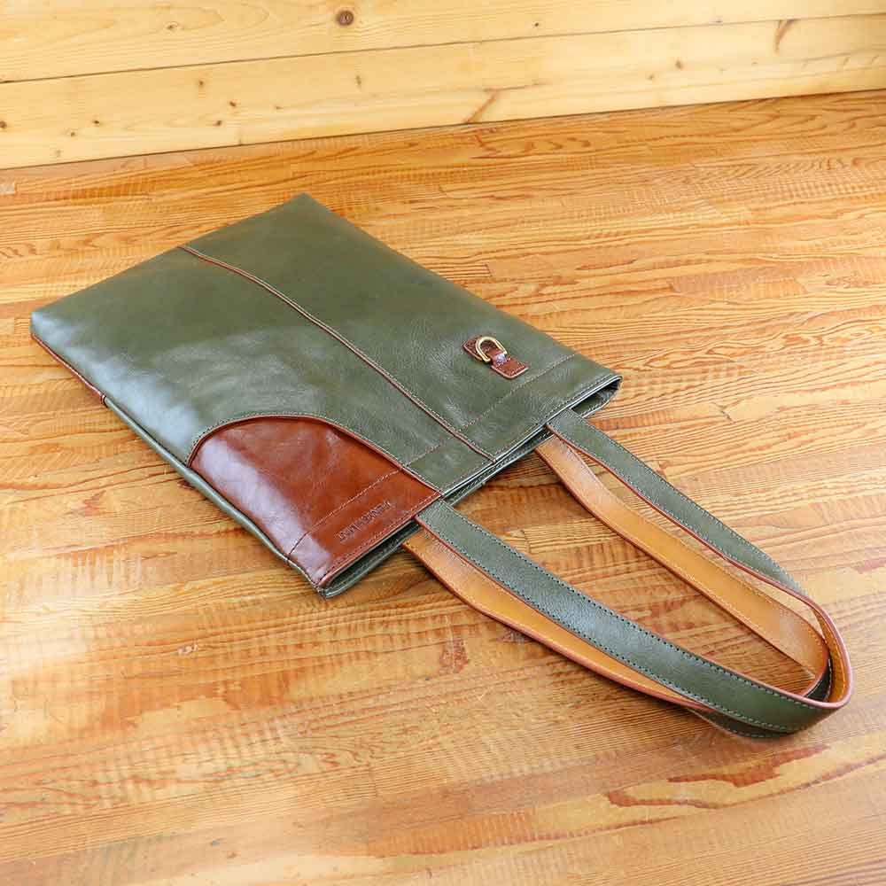 新色の渋めのモスグリーンも、主張し過ぎる事なくコーディネートに困りません。「入学・就職祝い」などにもとても喜ばれます。男性女性関係なくお使い頂ける幅広い用途のトートバッグです
