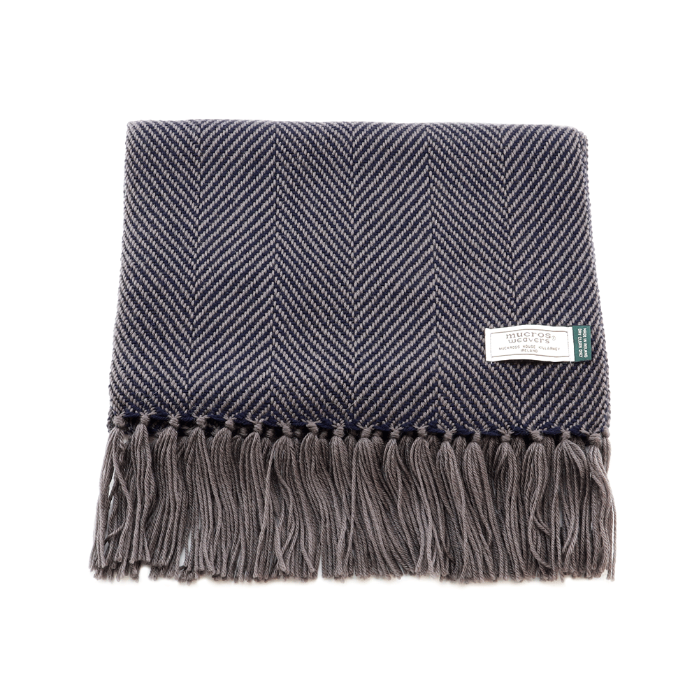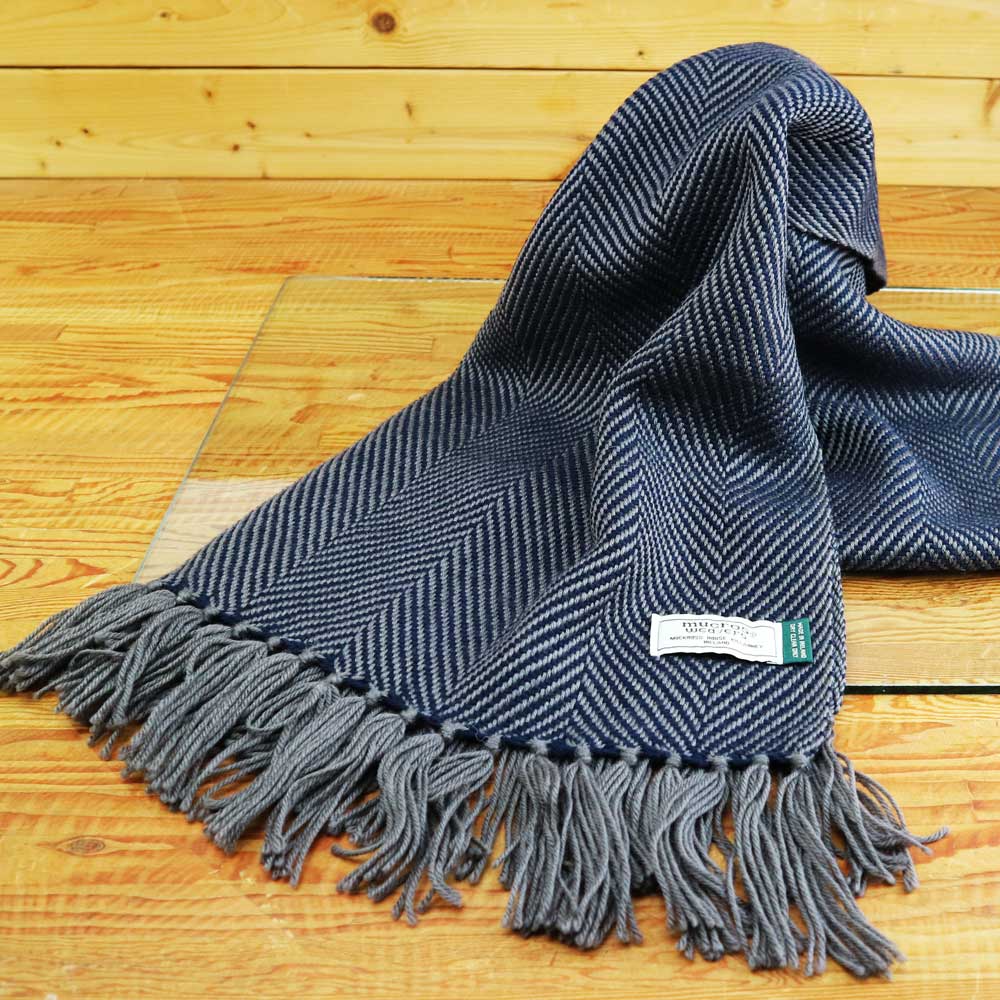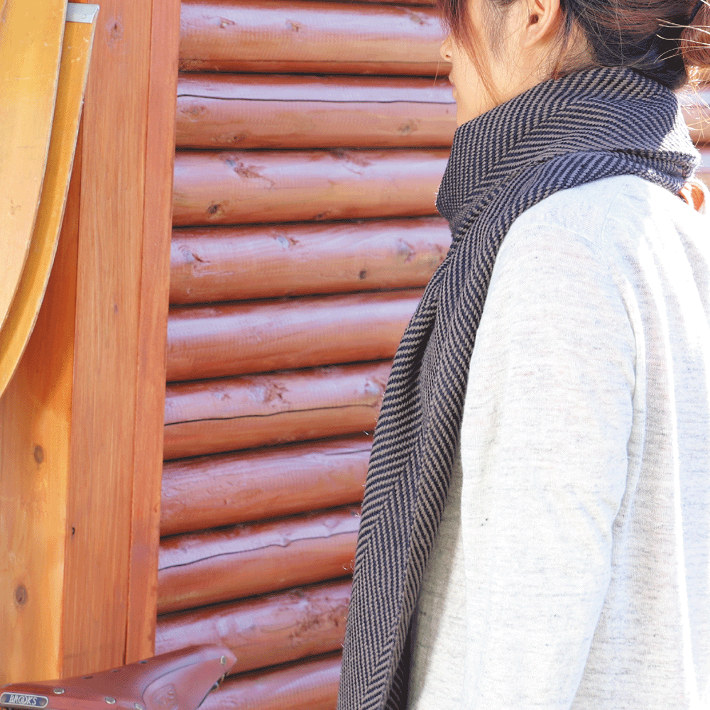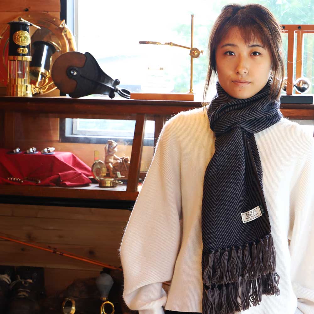 落ち着いたダークグレー基調の ヘリーボーンパターンのお洒落な100% ウールマフラー。