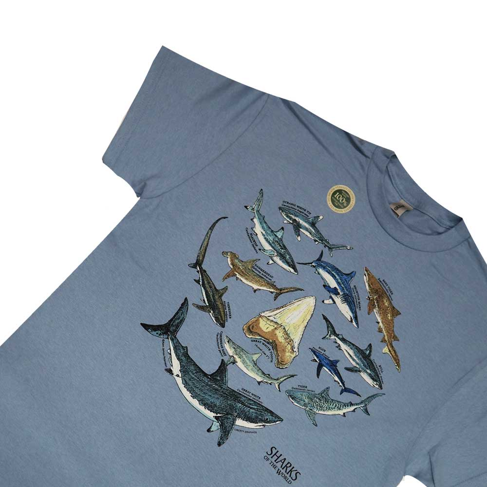 海のギャングサメたちをモチーフにしたワイルドライフTシャツシリーズ。進化の過程で手に入れたサメたちの歯。サメたちのクールな優美と歯 今年の夏はこんなTシャツを着て出かけたい。