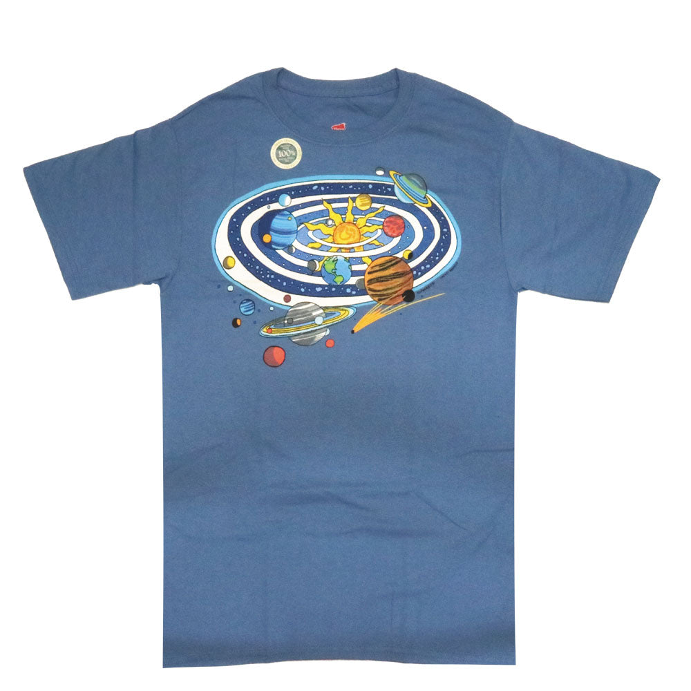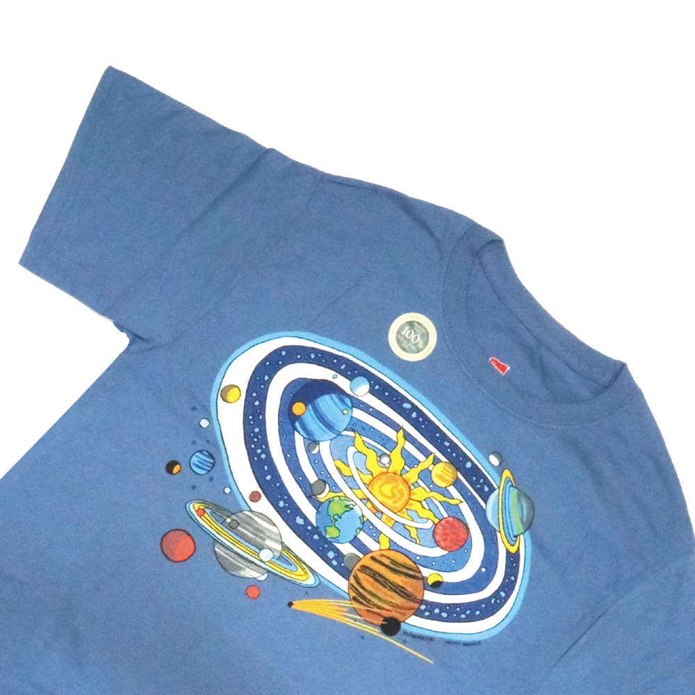 リバティーグラフィックアーティストの中でも少々風変わりなアートTシャツ。しっかりと地球の話ができる個性的なTシャツ ソーラーシステム。太陽があっての地球を真に大切にしたい。異色のシルクプリントTシャツです